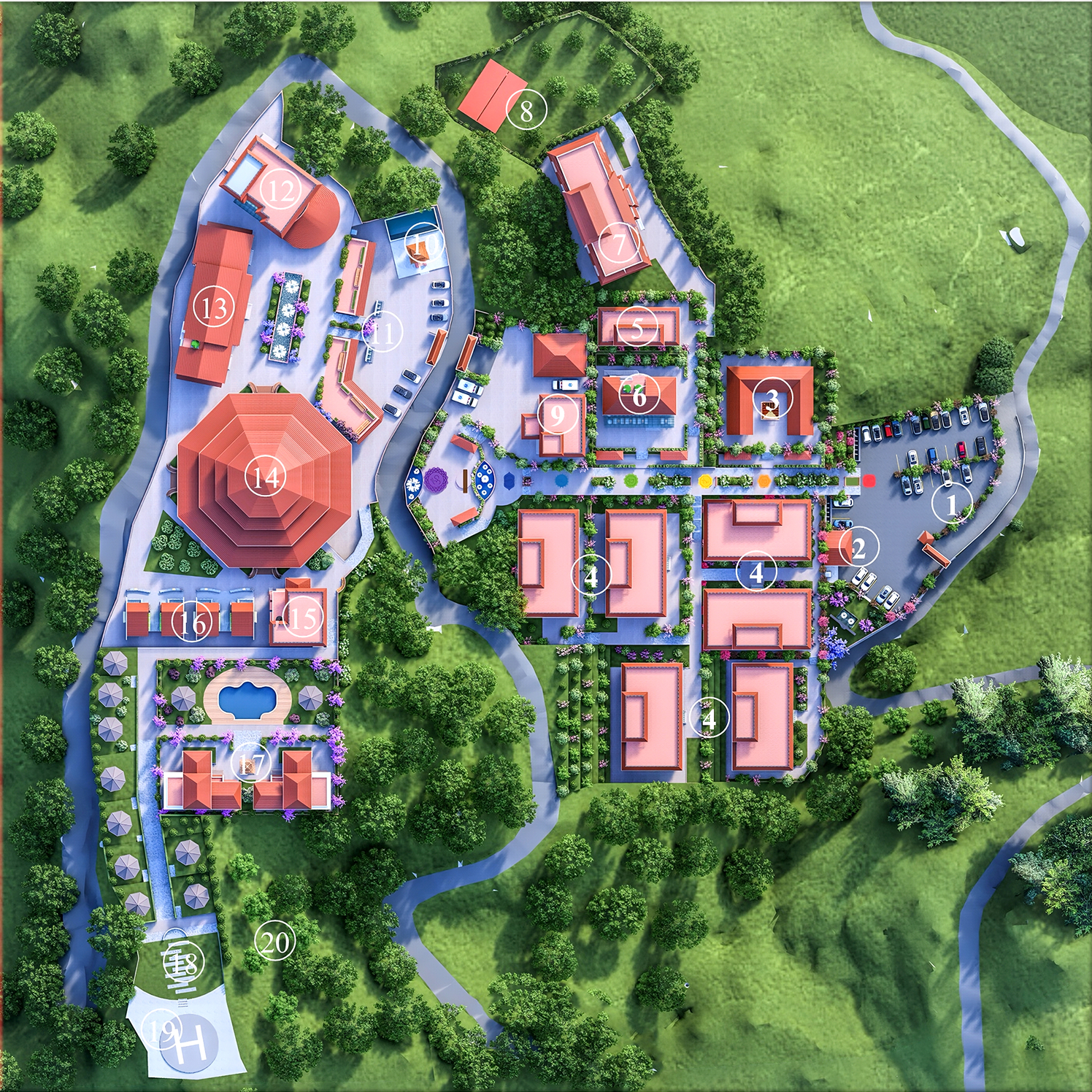 १. पार्किङ २. जानकारी तथा सूचना केन्द्र ३. पुरस्कार बिक्रि कक्ष ४. आवासीय भवन १ ५. आवासीय भवन २ ६. भोजनालय ७. छात्रावास + भुक्तानी गर्नुपर्ने कोठाहरू ८. गौशाला ९. स्वास्थ्य तथा आरोग्य केन्द्र १०. मन्दिर – २ ११. आगन्तुक कक्ष १२. भान्सा तथा कर्मचारी आवास १३. सम्मेलन कक्ष १४. ध्यानकक्ष १५. मुख्य कार्यालय १६. विशिष्टि पाहुना घर १७. गुरु निवास १८. खुला रंगमञ्च (एम्फिथिएटर) १९. हेलिप्याड २०. खुला ध्यान क्षेत्र